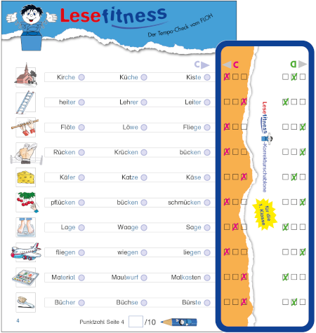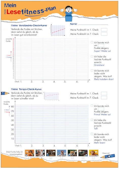 Darin werden die erreichten Punkte aller Verständnis- und Tempochecks eingetragen. Auf der so entstehenden Erfolgskurve sieht Ihr Kind auf einen Blick, ob und wie es sich im Lesen gesteigert hat!